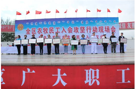 6月14日,全區(qū)農(nóng)牧民工入會攻堅行動現(xiàn)場會暨烏蘭察布市農(nóng)牧民工入會儀式在我市舉行。我公司組織30人的方隊參加了入會儀式。期間,自治區(qū)人大常委會副主任、總工會主席杭桂林,自治區(qū)總工會黨組書記、副主席崔明龍,自治區(qū)總工會副主席王麗紅,我市領(lǐng)導張琛、李建平、楊國文、王增強、王國相、于生龍,和各盟市工會分管主席、主管部門部長,各盟市黨委政府所在地的區(qū)(市、旗)總工會主席,各自治區(qū)產(chǎn)業(yè)工會負責人,自治區(qū)直屬機關(guān)工會工委負責人,區(qū)總相關(guān)部門負責人,市各旗縣市區(qū)工會負責人及部分市直基層工會負責人100余人來我公司進行了實地觀摩考察。